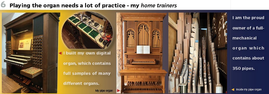 Me as an organist:  In my own church I am the organist, playing on a 32-stop organ containing >2.000 pipes, with a full mechanical action. It is a great pleasure to play the organ and accompany the congregation by singing the psalms. During the services around thousand people are in the church, what results in a massive sound of a full organ and all people singing the glory of God. It always impresses me.