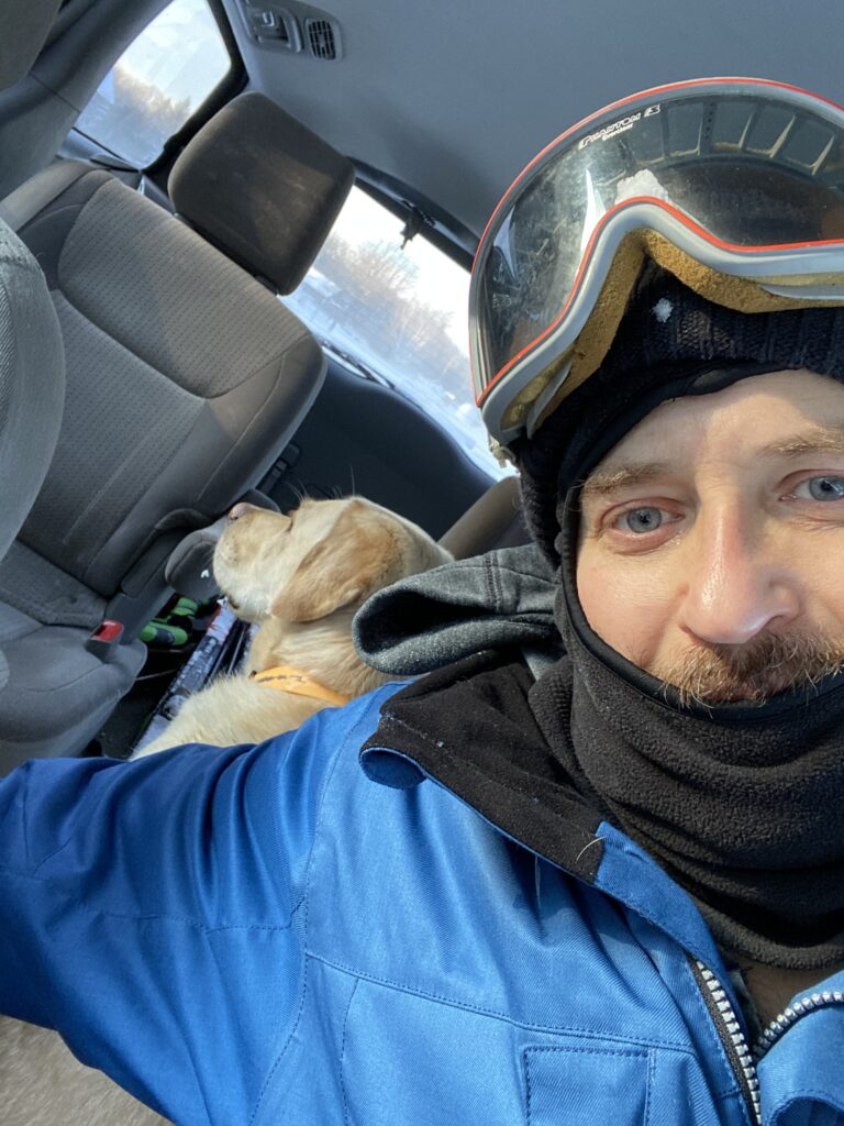 Janos loves the outdoors. In the picture he is heading to cross-country skiing with his dog.