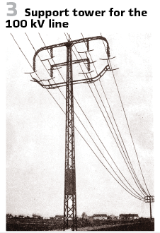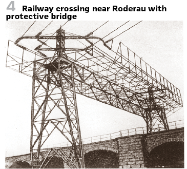 This had a particularly pronounced effect in high-voltage networks (> 50 kV), leading to the first use of twisting in 1912 for the first 100 kV three-phase transmission line in Europe, Lauchhammer-Riesa (see image). Among other things, the German Reichsbahn and the German Post Office demanded special protective devices in the form of so-called protective bridges for all crossings in public traffic areas and railway lines. (Figures 3/4).