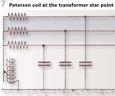 In its original AEG design, this earthing system consisted of three single-pole oil circuit breakers connected between the conductor and earth, each controlled by a zero-voltage relay, and served to relieve the earth fault location. The affected conductor was initially grounded temporarily twice. If the earth fault persisted, it was grounded a third time, but this time permanently. In 1917, Petersen first reported on the partial capacitances of overhead lines and the calculation of the earth fault current. In 1918, he published a paper on suppressing intermittent earth faults using zero-resistance resistors and spark arresters. Around the same time, he published an article on eliminating overhead line disturbances by suppressing the earth fault current and arc. Only then did Petersen develop an inductive earth fault coil at the neutral point of transformers (Figure 7).