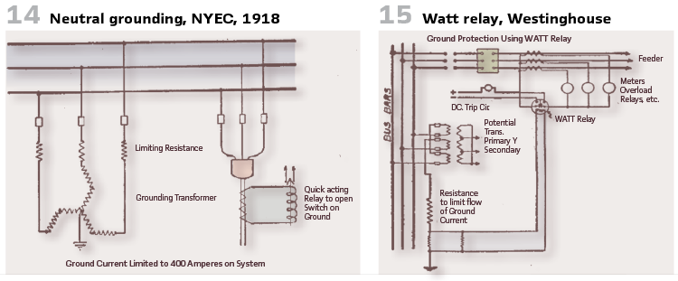 The 6600 V grid (25 Hz) of New York Edison Company was not grounded at the beginning. After a deep investigation and analysis, they decided to change this. Utilizing earth transformers connected to the system busbar a defined earth current was created and connected to an earth relay, which tripped the oil circuit breaker. The method of earthing via “zigzag” connected transformers was chosen because the generators have been delta connected- a neural connection was not available in that case. The limiting resistances have been connected to the primary side and limited the cumulated earth current for the power stations operated in parallel to 400 A. The selective earth relays, operated by the sheath current transformers could handle between 140 A and 300 A for at least 1 s (Figure 14).