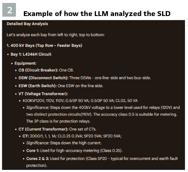 In the second test, a set of generic Single Line Diagrams (SLDs) were created ranging from simple single-bus, two-line stations up to 1.5CB stations with 12 lines and transformers. The SLDs were given to the LLMs in PNG image and PDF file formats. The LLMs were asked to extract information for a specific, named bay (e.g. “400 kV Line #2”) and also to repeat the task for every bay they found the SLD. They were also asked to provide a technical explanation of what each parameter meant (what does CT burden mean) and the significance of the value (what does a CT burden of 5 VA tell us). They were requested to return information such as station name, busbar topology, CT, VT, CB, relay information, and communications information for each bay, as well as rating, winding types, and impedance of any transformer.