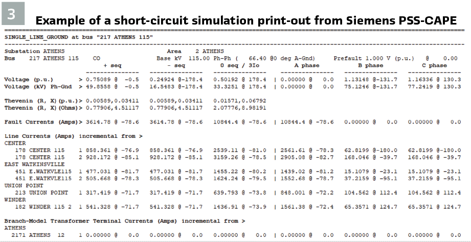 Most short circuit analysis tools print simulation results in text format to a message window. Each tool has a unique default format stating fault location, fault type, phase currents and voltages, sequence currents and voltages, Thevenin equivalent circuits, and X/R. They may also include protection trip times, coordination margins, and other relevant information. Figure 3 shows a typical example from Siemens PSS-CAPE.