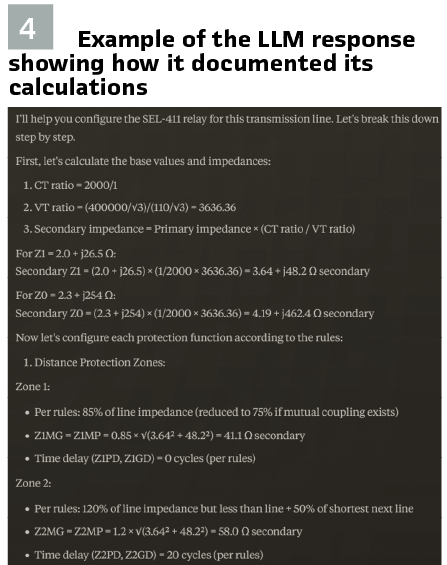 This shows the value of research prompts to identify LLM flaws – once we know the LLM gets something wrong, we can prevent the error in the future by including the rule as a line item in the relay settings document. The LLMs were able to explain the purpose of each protection function and how it calculated each setting. (see Figures 4 and 5).