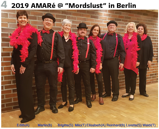 When I heard in 2019 that the choir director of the Charmonies was now also publishing her own crime novels, we organized a reading combined with a joint concert of the Charmonies and AMARè with “criminal” songs and performed this format under the title “Mordslust” in October 2019 in Berlin. (Figure 4).