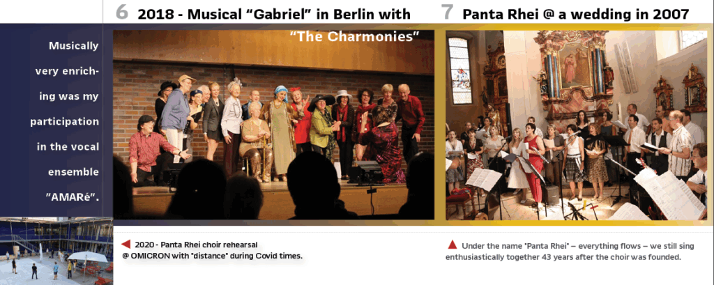 In 2019 we sang a concert in Prague together with a Czech choir, and in 2025 the participation in the choir festival “Fire and Voice” in Lungau/Salzburg was the highlight of our choral year. At Panta Rhei, many friendships were formed for me that have lasted through the decades. (Figures 3 & 7).