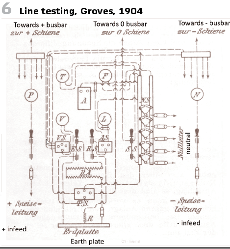 Also in the UK at IEE isolation testing was a topic. It was in Birmingham when W.E. Groves presented a scheme for line testing in 3-phase low voltage grids in 1904. The neutral wire was grounded with 2 Ohms (Figure 6).