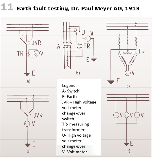 A range of products manufactured by Dr. Paul Meyer AG for ground fault testing is shown in Figure 11. To check the lines for ground faults, a soft iron voltmeter can be used, which is connected in conjunction with a voltage transformer a) and b) or a measuring transformer c) or static voltmeters can be used (Figure 11).
