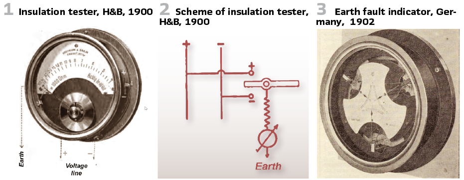 Figure 1 shows an insulation tester from Hartmann & Braun (H&B) in Germany in the year 1900. Figure 2 shows the scheme. The lever visible on the right is first set to the “+” position. The single-pole insulated device is thus connected to the line. Then, it is switched to the “-” position. If the pointer moves only in one position, the deflection corresponds to the fault resistance of the other conductor. If the pointer is at 5MOhm in the “+” position and remains at rest (infinite) in the “-” position, the fault resistance of the negative conductor is 5MOhm, while that of the positive conductor is comparatively high.