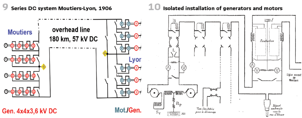 Work was also carried out on improving remote transmission with direct current. However, the machines in the power plants and at the consumers’ premises could only be built to operate safely at limited voltage values. René Thury therefore developed his own system in 1905. (Figure 9 ).