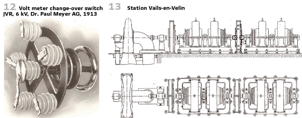 All machines, both generators and motors, were operated in series and equipped with the same switch, namely a changeover switch. Apart from it, each machine only contains an ammeter and a voltmeter, the motors an automatic short-circuiting device. In the power transmission system from Moutiers to Lyon, which was put into operation in 1906,