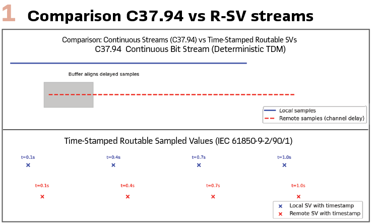 Sampled Values Communication: C37.94 vs IEC 61850-9-2/90-1: Line differential protection schemes rely on accurate alignment of current and voltage samples between line ends. Traditionally, C37.94 continuous bit streams provide deterministic transport using time-division multiplexing (TDM). Local and remote streams are continuously aligned, with small buffers compensating for fixed channel delays, ensuring synchronous comparison of samples. By contrast, IEC 61850-9-2/90-1 routable sampled values embed time stamps within each message. This approach allows samples from different line ends to be aligned based on their time tags, regardless of varying network delays. Instead of a continuous bit stream, discrete, time-stamped packets are compared at defined instants (e.g., t=0.1s, 0.4s, 0.7s, 1.0s). This removes strict dependence on channel determinism and supports modern packet-switched networks.