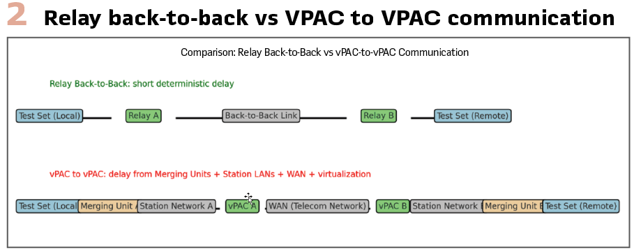 Comparison: Relay Back-to-Back vs vPAC-to-vPAC Communication: Traditional relay back-to-back testing involves two physical relays directly interconnected, with only a short and deterministic propagation delay across the back-to-back link. This setup provides a simple, controlled environment to validate line differential schemes with minimal latency.