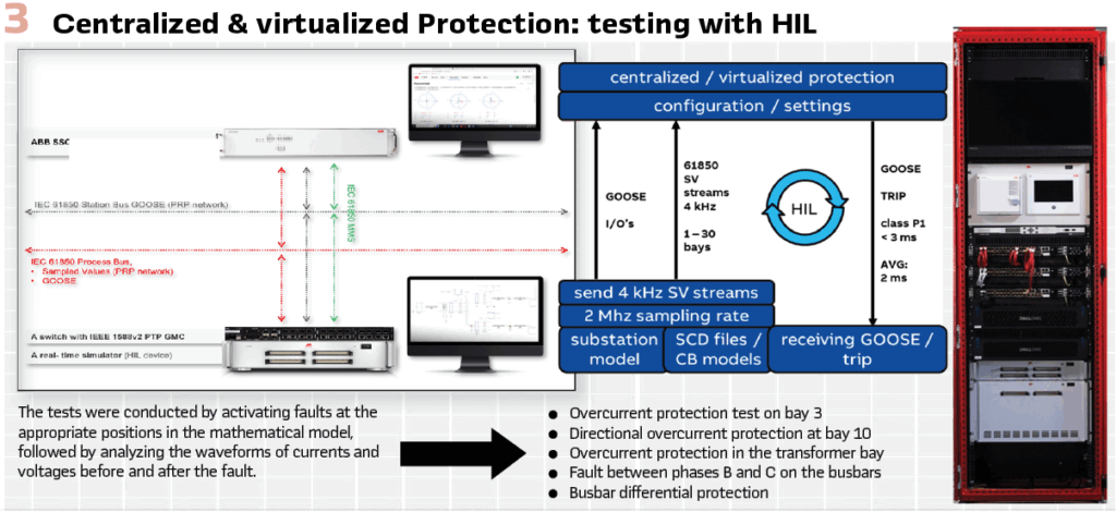 This setup provides a realistic laboratory environment to benchmark new architectures for digital substations, ensuring protection reliability while transitioning from conventional relays to virtualized protection functions.