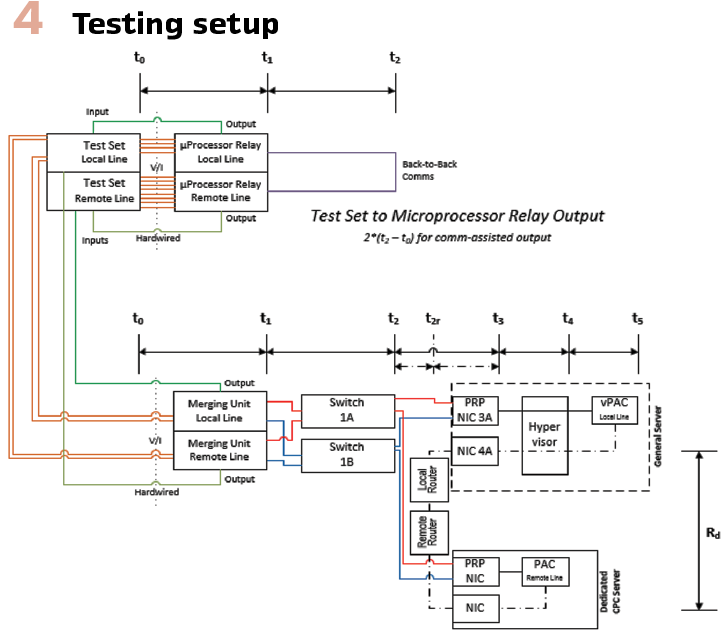 This configuration of test sets provided hard-wired signals for both the local and remote microprocessor relays, as well as for the merging units (publishing SV at 4.8 kHz and receiving commands from vPAC via GOOSE messaging). Final tripping outputs were connected directly from both device types into the test sets to measure round-trip timing