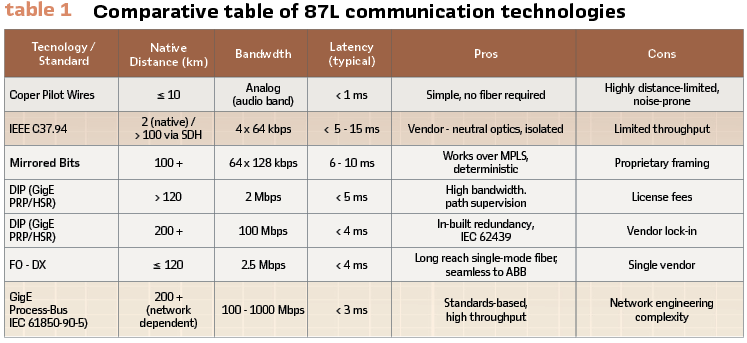 Today, utilities face highly meshed grids, multivendor interoperability requirements, and growing cybersecurity mandates. This chapter situates ABB Electrification’s SSC600 v1.5 within that landscape. We begin by contrasting the most common physical interfaces and communication profiles used for 87L schemes. (Table 1).